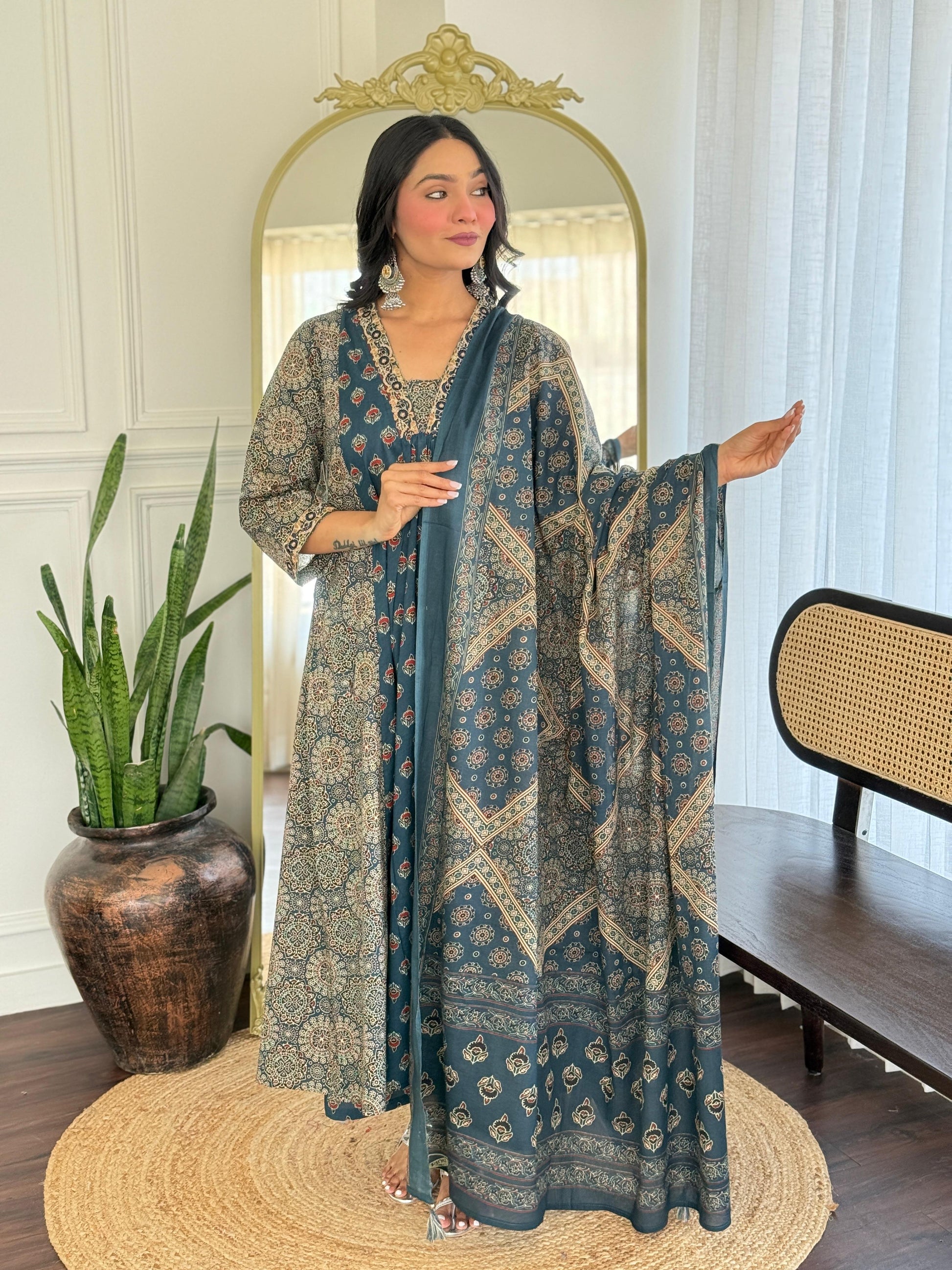 Crafted from premium 60/60 pure cotton, this A-line suit is adorned with beautiful heavy sequence handwork embroidery and charming tassel details on the kurti. The breathable fabric ensures comfort, while the detailed embellishments make it a standout choice for festive gatherings, cultural events, or casual celebrations.