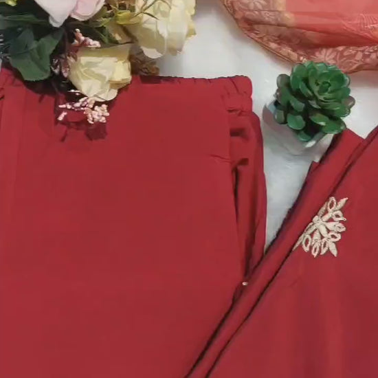 Step into timeless elegance with The Lady Crown’s Premium Roman Silk Maroon Suit Set, designed for women who love rich fabrics, intricate embroidery, and a luxurious festive look.