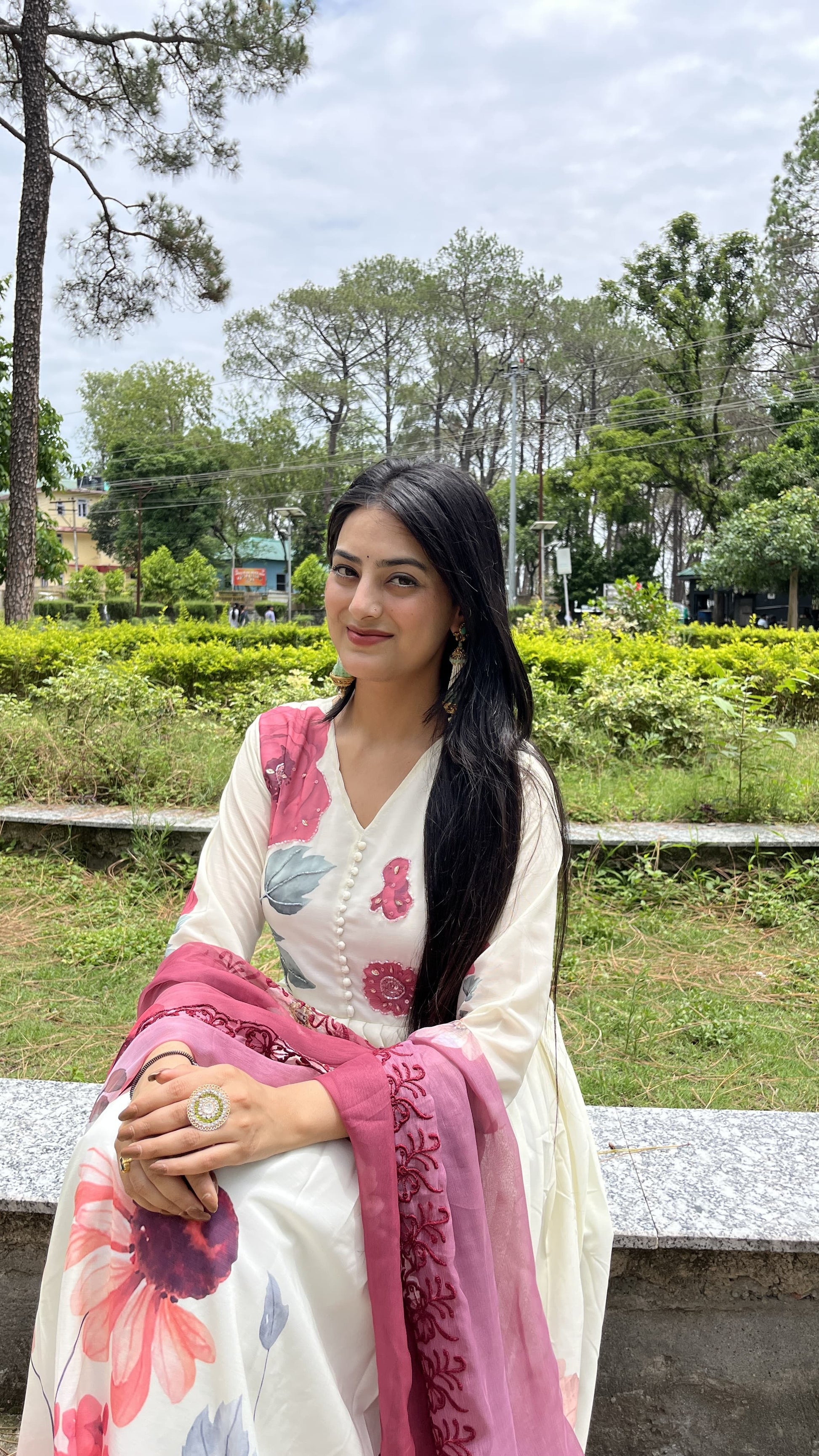 Artisanal Detailing: Floral digital print combined with embroidery and handwork.