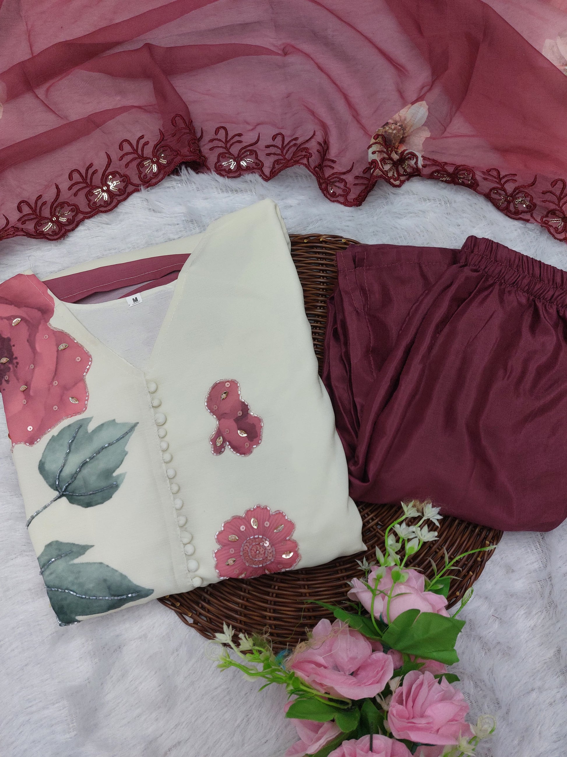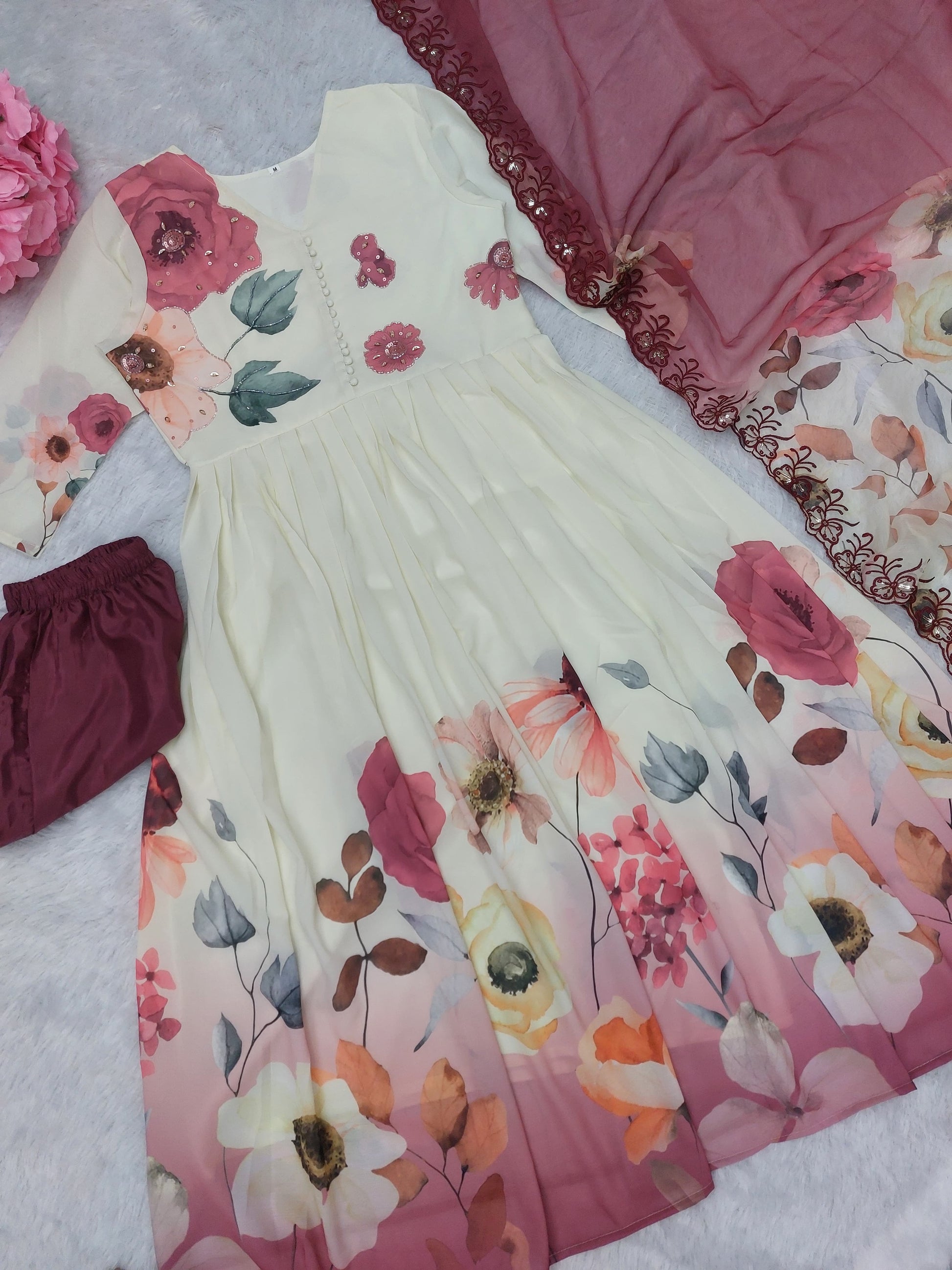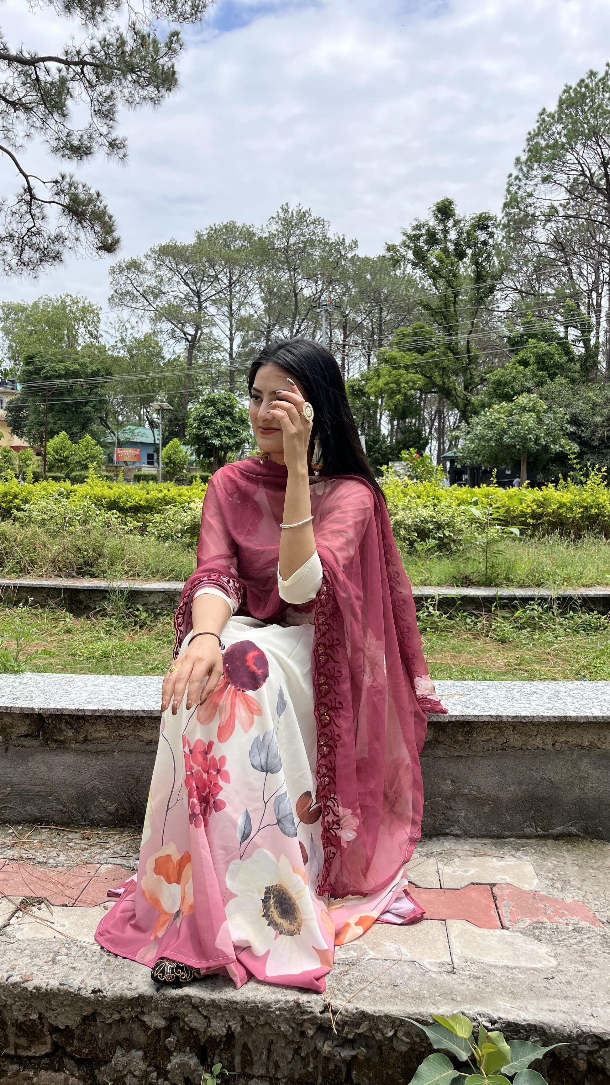 The Lady Crown – White Floral Print Chiffon 3-Piece Suit Set with Embroidery & Handwork